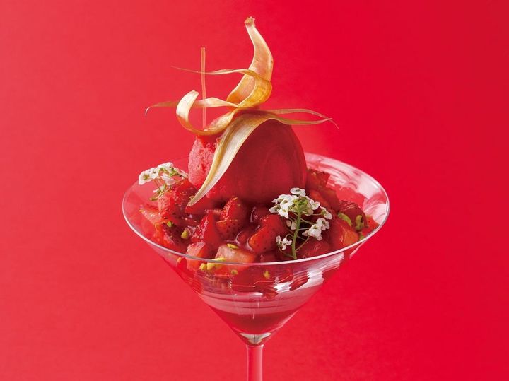 いちごのジュレ、アイス、ソースとフレッシュなイチゴをふんだんに使ったいちごづくしの豪華なパフェ。「Toshi Yoroizuka(トシ ヨロイヅカ)」の東京ミッドタウン店限定「Fleur de fraise(フルール ド フレーズ)」(1,500円)(画像提供:東京ミッドタウン)