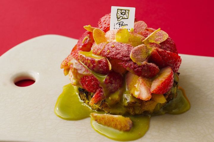 国産の大粒いちごを丸ごと3粒贅沢に使ったオリジナルのフレンチトースト。アーモンドチップで香ばしさと食感のアクセントをプラス。濃厚なピスタチオ練乳をたっぷりと絡めて、ちょっぴり大人の味わいを楽しんで。「Le Pain Quotidien(ル・パン・コティディアン)」の「3ストロベリーパンペルデュ 自家製無農薬レモンマーマレード/ピスタチオ練乳ソース&バニラアイスクリーム」(1,500円)はイートインのみ(画像提供:東京ミッドタウン)