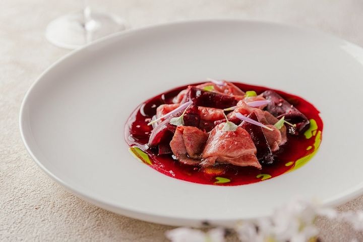 やわらかな肉質の黒毛和牛のうまみとビーツの甘み、香りが楽しめる一品。ピンクペッパー、彩りにグリーンのハーブオイルがアクセントに(画像提供:ひらまつ)