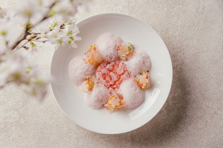 前菜2品目は、甘みが凝縮された甘エビのミキュイ。蕪(かぶ)をエビのオイルと和えて添え、仕上げに桜がほんのり香るピンク色の泡を加えた華やかな一皿(画像提供:ひらまつ)