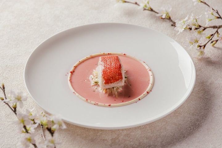 金目鯛をしっとりと蒸し上げ、旬のおいしさを最大限に引き出したシンプルな一皿。金目鯛の下には、細く刻んで桜のオイルと和えたフレッシュのホワイトアスパラガス。シャンパーニュを贅沢に使用した桜色のソースで(画像提供:ひらまつ)