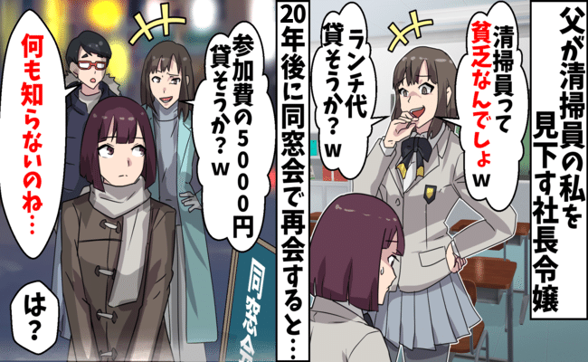 父が清掃員の私を見下す同級生と20年後に同窓会で再会⇒昔と同じように金持ちアピールをしてきた結果