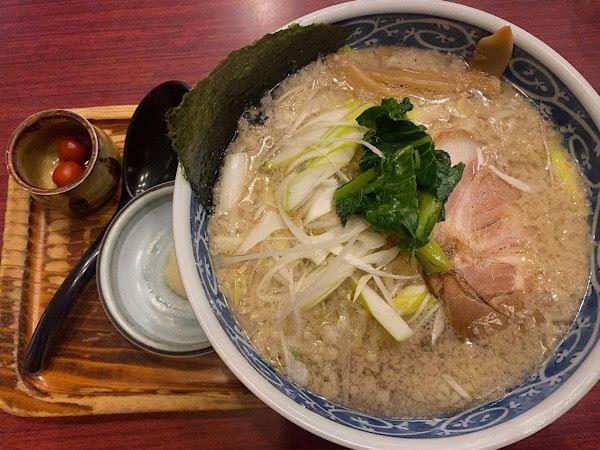 背脂らーめんは、そばつゆのような出汁のきいたスープとたっぷりの背脂の組み合わせが新鮮でした。別添えのにんにく擦りおろしを入れると、ガラッと表情が変わってこれまた美味!