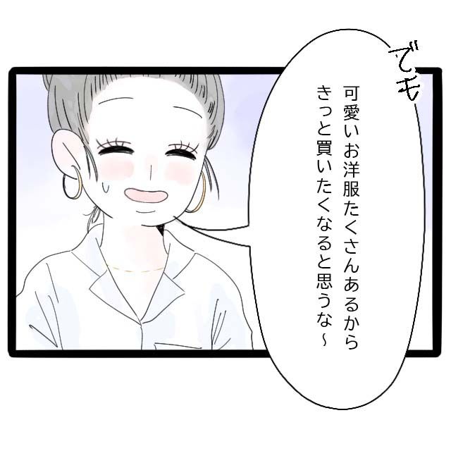 「でも・・かわいいお洋服もたくさんあるからきっと買いたくなると思うな~」なんとなく拒否している雰囲気がでているママさん。