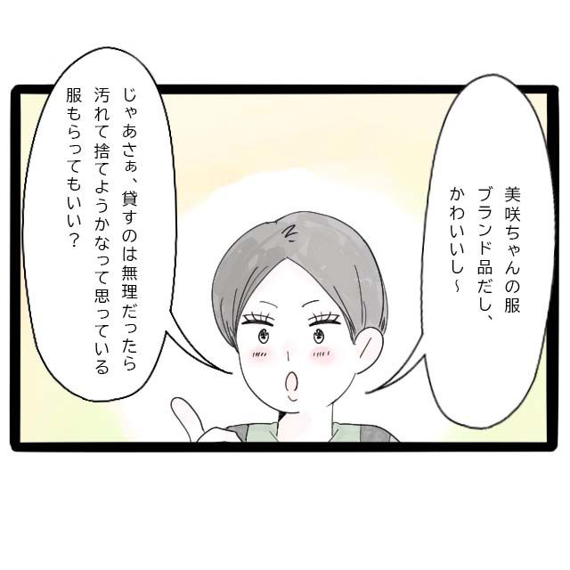 お洒落が大好きで可愛いお洋服を着ているらしいみさきちゃん、するとお友だちのママさんが「みさきちゃんの着なくなったお洋服、貸してくれない?」と言い出して・・それを聞き「貸してから返すの?」と驚いていると・・