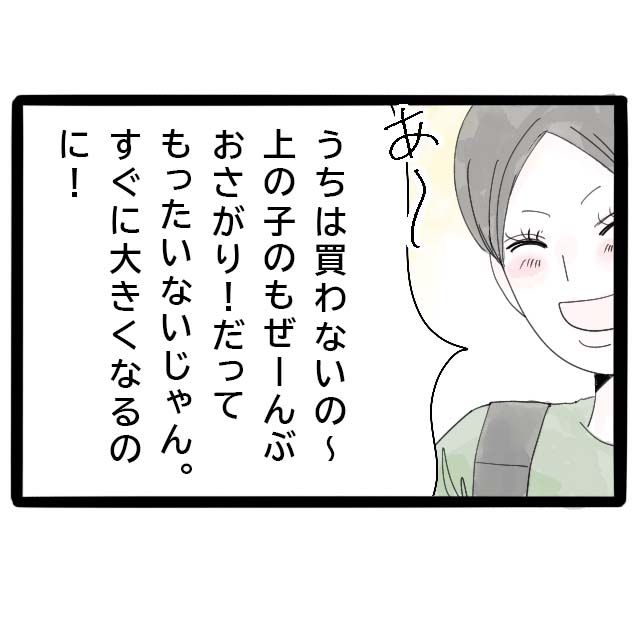 「あ~。うちは買わないの!上の子のもぜーんぶお下がり!だってもったいないじゃん。すぐ大きくなるのに!」