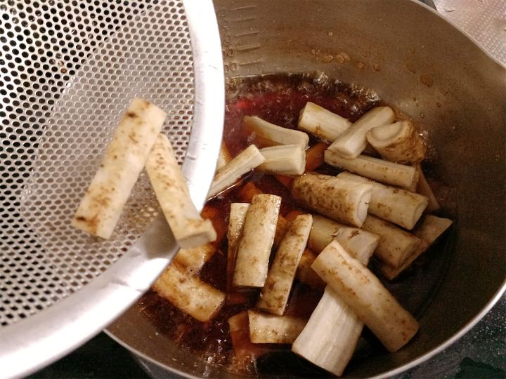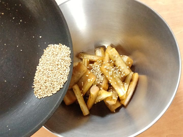 4.煮えたらごぼうだけを取り出し、白いりゴマを絡ませて完成。