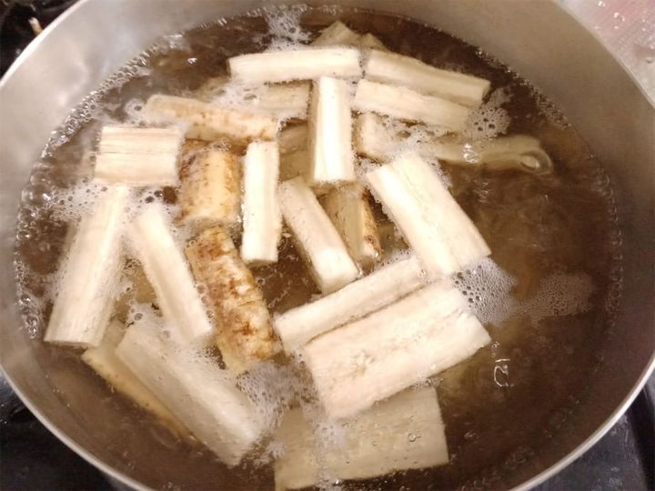 2鍋にごぼうが浸るくらいの水(分量外)を入れ沸騰させ、1を入れたら2~3分煮てざるに上げ、水気を切る。