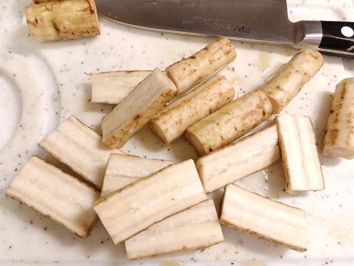 1.ごぼうは皮の表面の汚れを軽くこそぎ、4cm長さに切る。(太いものは2つ割りまたは、4つ割りにしてもよい)