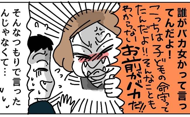 「バカ女」のひと言で私の怒りモードもスイッチオン。「は? 誰がバカだって? もう一回言ってみろよ」と低いトーンで返答しました。いつもとは違う私の姿に「え……?」と慌てふためき始めた夫。「誰がバカ女かって言ってんだよ! こっちはずっと看病してたんだよ! 子どもの命守ってたんだよ! そんなこともわからないお前がバカだ!」とまくしたてる私。