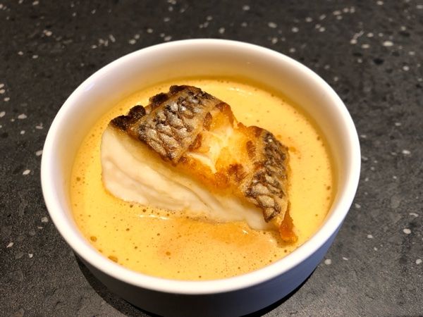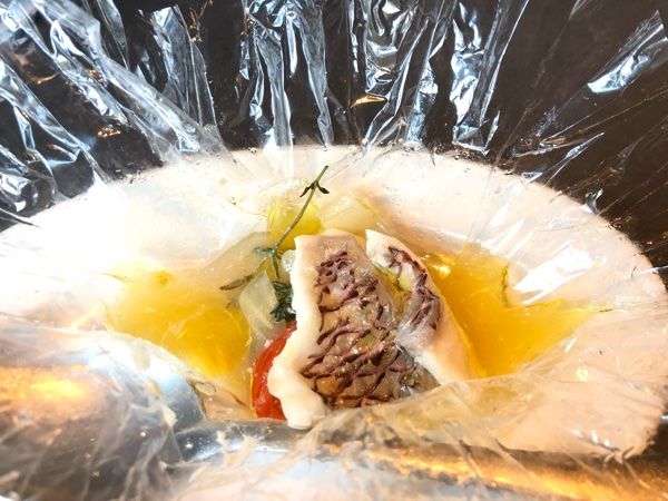 真鯛のカルトッチョ(お魚の包み焼)は、パンから作ったお醤油とアサリの出汁の旨味が感じられる優しい味わいです。