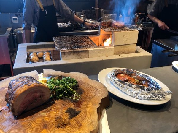 falò+(ピュウ ファロ)は炭火焼きと醗酵技術をテーマにしたイタリア料理店です。目の前で網焼きしているポルケッタ(塊肉)を頂けます。