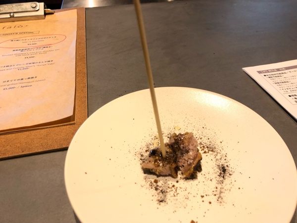 自家製発酵調味料"豚の熟鮓"とスパイスを使ったポルケッタ。炭のお塩と味噌パウダーがアクセント。
