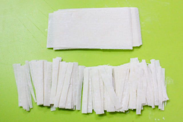 1.焼売の皮を半分に切り、1mm幅の千切りにします。