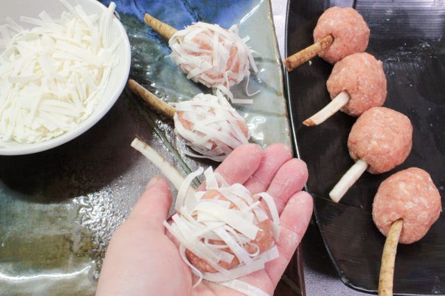 4.肉だねを8等分にして俵型に成形し、切った焼売の皮をまぶして水気を切ったごぼうを刺します。