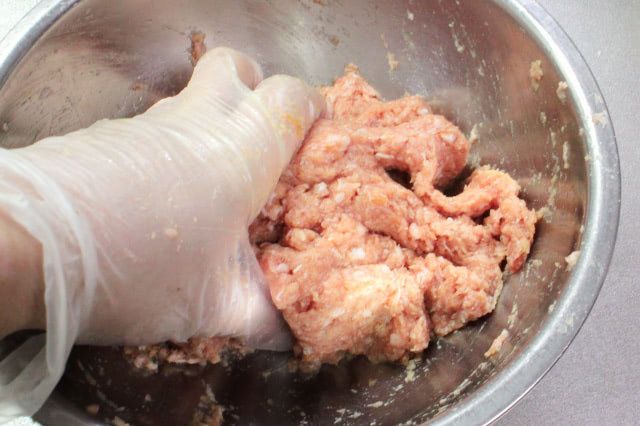 卵とパン粉を混ぜるので、ハンバーグの肉だねのようなやわらかさ。粘り気が出るまで捏ねました。