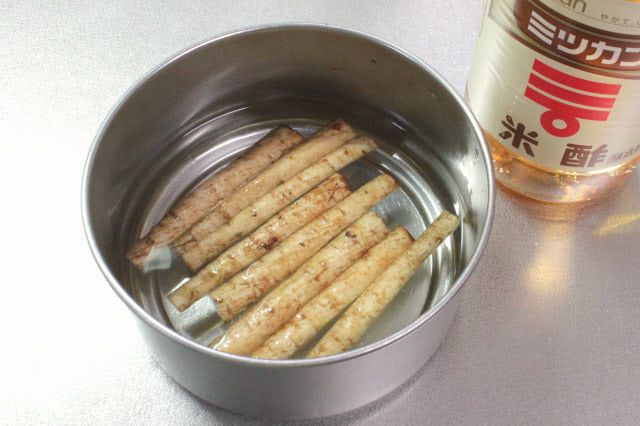 2.ごぼうを縦4等分に切ってから長さ半分に切り、酢水に晒します。
