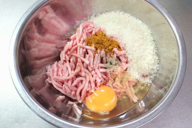 3.ボウルに豚ひき肉、卵、パン粉、しょうゆ、カレー粉、こしょうを入れてよく捏ねます。