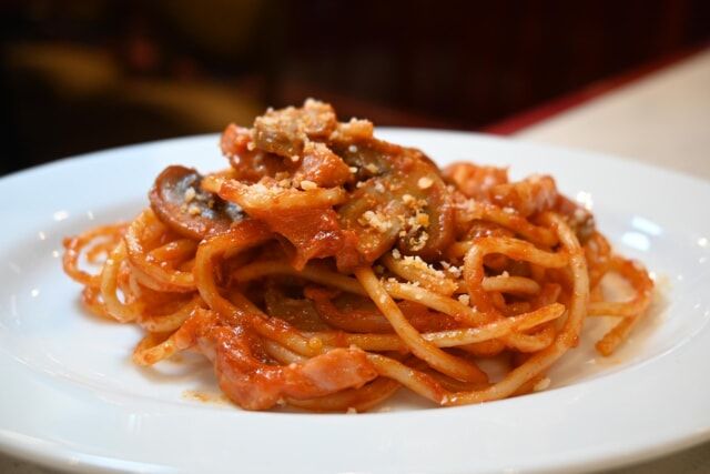 横浜発祥のスパゲッティナポリタンも見過ごせません。お店独自の味わいが楽しめる「濱のナポリタン」は数種類のケチャップをブレンドし、火入れ時間などにもこだわります。ベーコンや玉ねぎ、マッシュルームをトッピングして、ケチャップはほんのり酸味を残しつつ、トマトや野菜の甘味も感じらる逸品です。粉チーズは軽めに振って、ナポリタンの味そのものを楽しんでみてください。