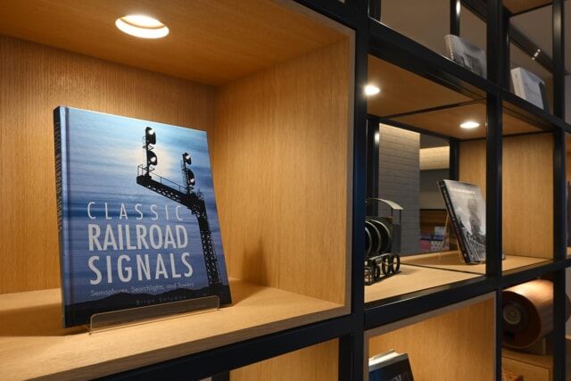 ▲ロビーのラックには横浜周辺に関連する書籍のほか、鉄道関連のオブジェや写真集などが置かれます