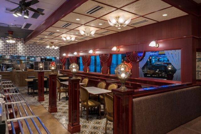 この一画は落ち着きのある赤色に仕上げ、アンティークなランプが明りを灯すほか、窓にはタッセルで留めた優雅なカーテンを飾ります。ディナーの予約ではこの席を指名するお客さんもいるのだとか。
