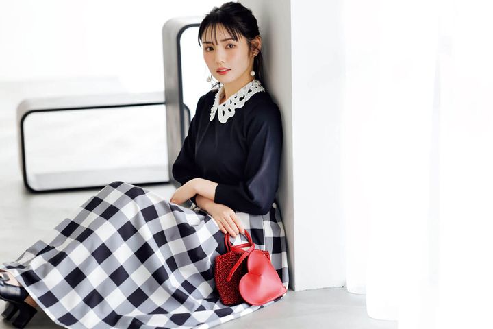 ニット¥5,500/index スカート¥5,990/Isn’t She? イヤリング¥3,800/ルナシック(ロード ス) バッグ[ハート]¥2,970/カシュカシュ(アンビリオン) バッグ[四角]¥36,300/アンテプリマ/ワイヤーバッグ(アンテプリマジャパン) 靴¥8,910/RANDA
