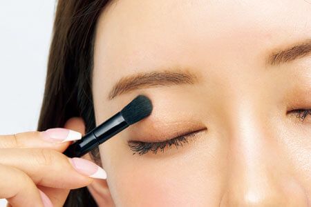アイホールにEのアイシャドウの右上をのせて立体感を出し、右下をまつ毛のキワから乗せて二重幅より少し広めにボカす。