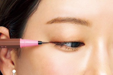 Fのアイライナーでまつ毛とまつ毛の間を埋めて、アウトラインは細く引く。目尻は細くスッと真横に5mm伸ばして目幅を延長。