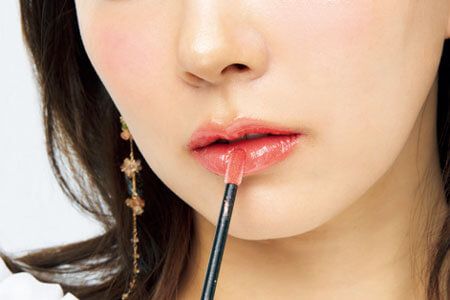 Iの透け色ルージュを直塗りして全体に血色感を出す。最後にJのグロスを輪郭まで全体的に塗ってプルプルに♡