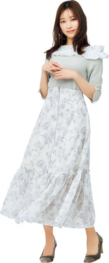 色は肌の透明感が生きるベージュ系のワ ントーンにまとめて、繊細な花柄シフォンやフリルなどの質感をプラス。ハイウエストの縦ジップスカートなら、淡いコーデでもスタイルUPが可能。