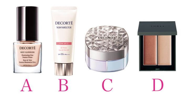 Aのパール入り下地とBのCCクリームを混ぜて全体に塗り、くすみを飛ばします。Cのお粉をフワッと全体にのせたら、Dを目尻の下、眉間、鼻先、アゴ先に仕込みます。