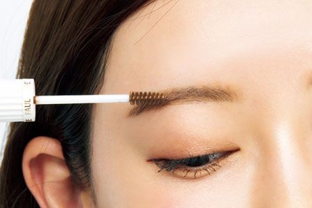 Gの眉マスカラで逆毛を立てるように塗る。次に毛流れを整えるように塗り重ね、眉色を明るくして、眉の印象を弱める。