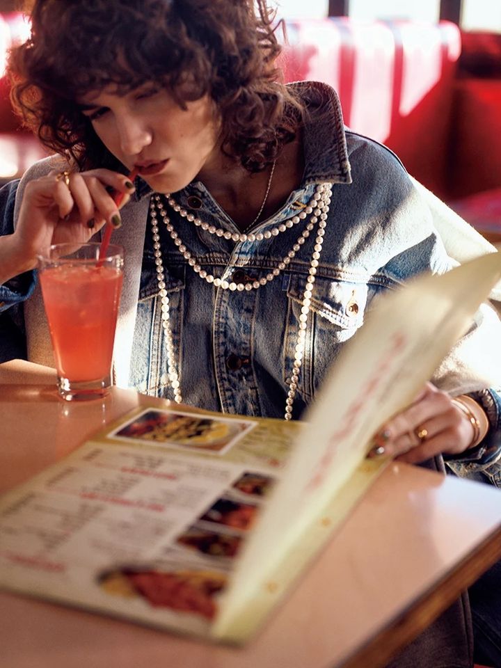 オケージョンにも向くパールネックレスは、何重にもレイヤードすると、デザインアクセ風の高感度な見た目に。飾りだけで十分華やぐから、デニムやロゴスエットで、ほかはカジュアルを貫く自信が持てる。