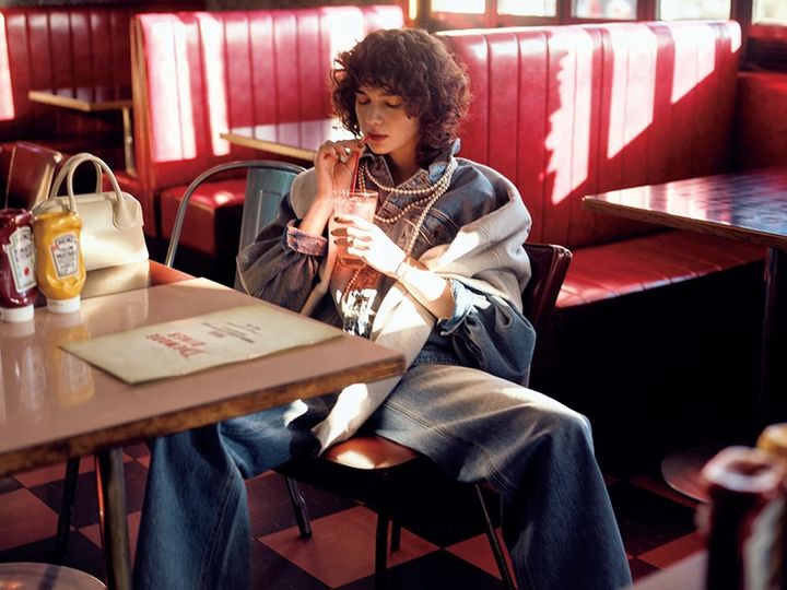 デニムジャケット 24,200円/SeaRoomlynn ロゴスエット 9,800円/Long Beach OMOTESANDO デニムパンツ 13,970円/MOUSSY(バロックジャパンリミテッド) 首に巻いた白パールネックレス 14,300円/Jouete 2連に巻いたパールネックレス 17,280円、ロングパールネックレス 14,040円/ともにアビステ 【左手薬指】ゴールドリング 30,800円/リューク 【右手薬指】ゴールドリング 16,500円、ゴールドバングル 37,400円/ともにete 机に置いた白バッグ 38,500円/オソイ ベージュパンプス 44,000円/LAURENCE(ザ・グランドインク)