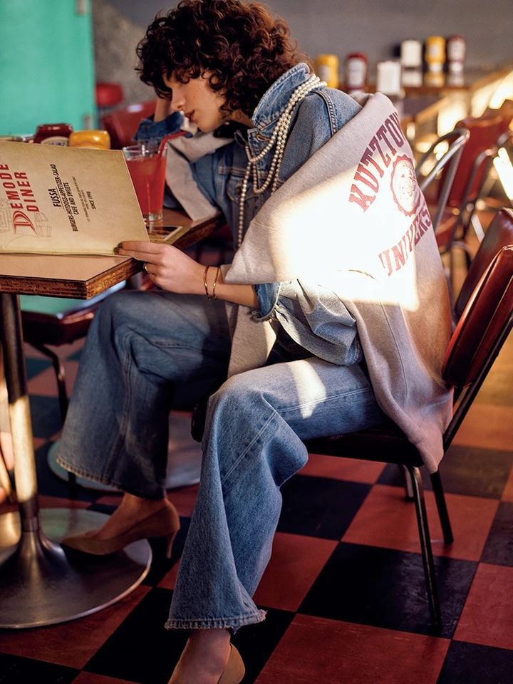 デニムの上下にロゴスエット。まるで街中でふと目にとまる洒脱な男の子のような、カジュアル度の高いスタイリング。アイテム自体はベーシックなのに、パールを重ねることで「品のいいくずし」が叶う。