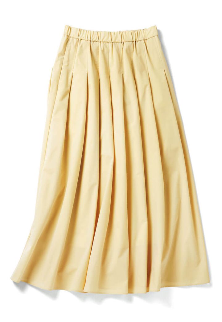 いつものベージュスカートをイエローにスイッチするだけで、春コーデがあか抜ける! ウエストからのタックでふんわりお上品に広がります。