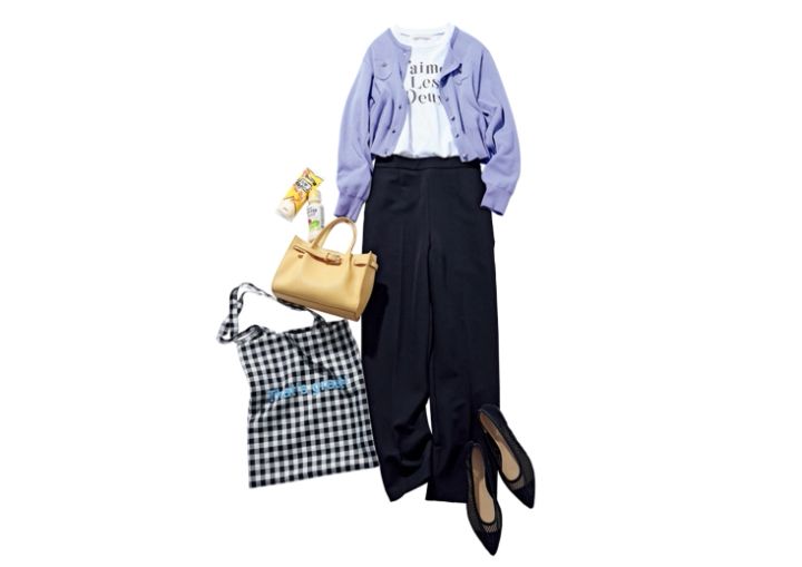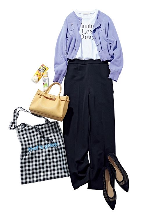 セットアップ(パンツ)¥19,910/ミラ オーウェン ルミネ新宿2店、ニットカーディガン¥18,700/カデュネ、リボンTシャツ¥6,490/31 Sons de mode(ヒロタ)、イエローバッグ¥11,000/アンタイトル、チュールパンプス¥2,290、トートバッグ¥590/ともにGU