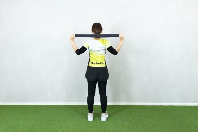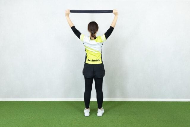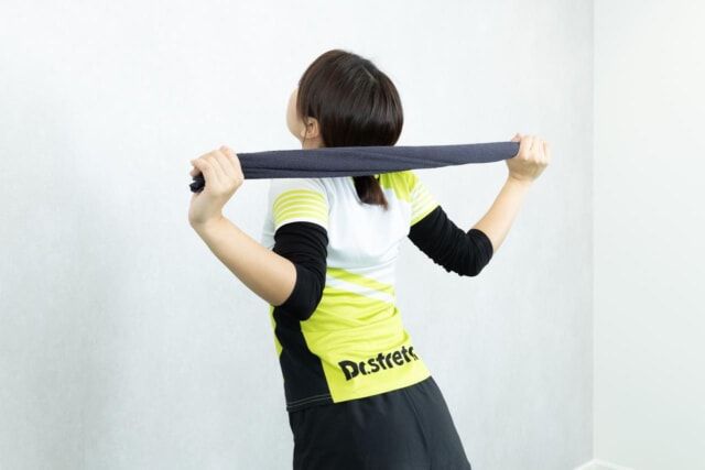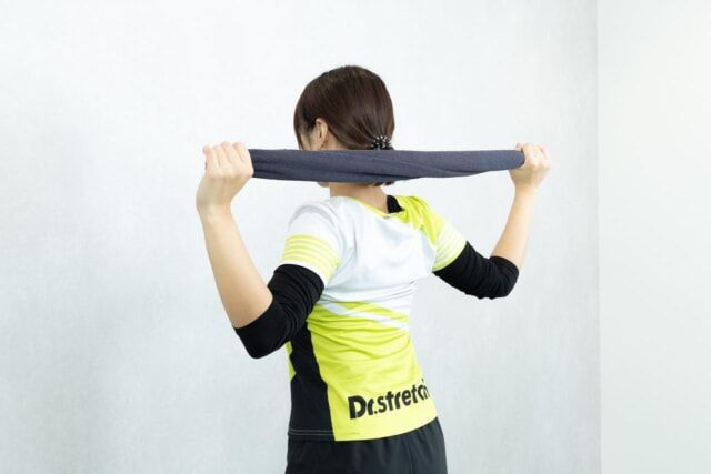 (2)肩甲骨を寄せるイメージでタオルを頭の後ろで下げ、下げきったところで2〜3秒間キープして(1)に戻る