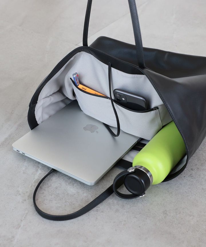 PCやA4書類もラクラク入るバランスの取れたトートバッグ。バッグ本体が軽いので、たっぷり入れても持ち運びしやすい! 内側のスマホや小物を収納できる2つのポケットと、ファスナー付きのポケットも◎。絶妙な長さのハンドルで肩掛けしやすい。