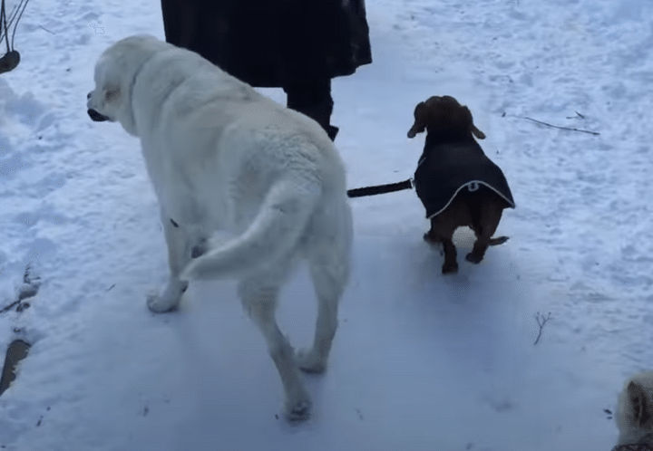 2. 「僕の役目なの♪」小型犬の散歩を手伝ってくれるおじいちゃん犬。
