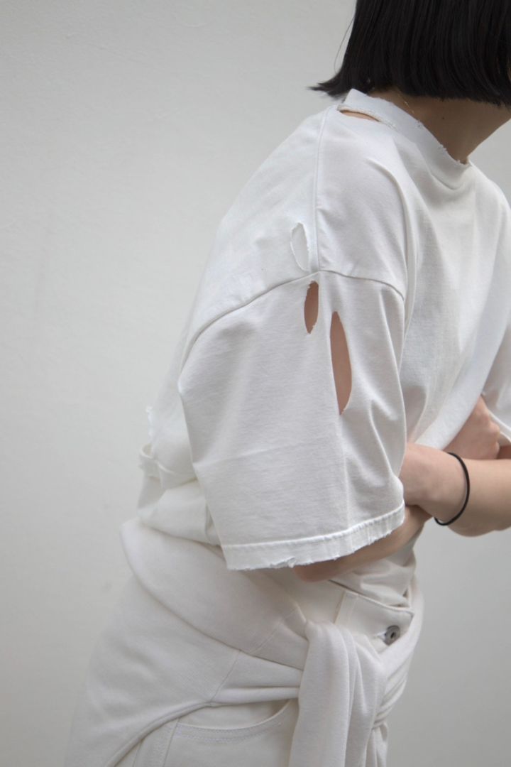 「クラッシュの入ったカットソーをメインにコーディネート。粗野な素材感のトップスとパンツの組み合わせに、上質なカシミアのカーディガンのMIX感を楽しみました。カジュアルなスタイリングですが、オールホワイトで統一することでクリーンな印象に仕上げています」