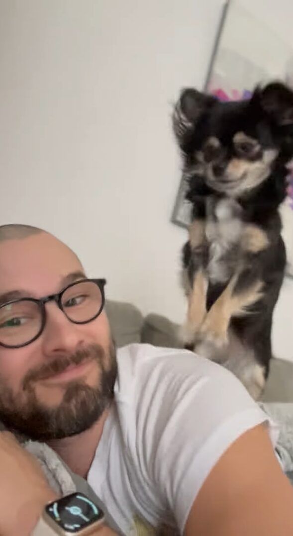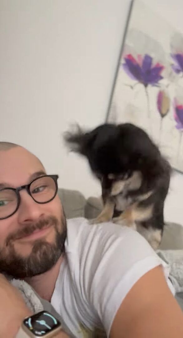 パパさんの肩にのった愛犬は、前足でふみふみマッサージ中。 しかしその様子は、想像以上に激しいですが・・・、どうやらかまってほしくてアピールしているところだったようです!!