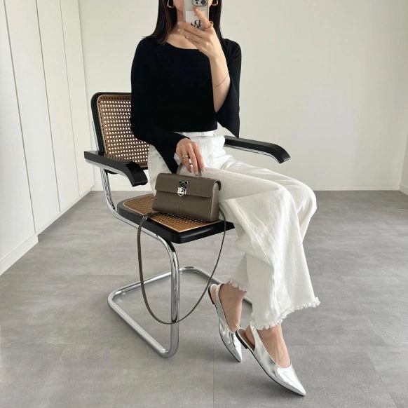 シルバーのバックストラップシューズは、モノトーンコーデとも相性のよいアイテムです。ゆったりとしたホワイトパンツなら、優雅な大人スタイルに。シルバーのアクセサリーをプラスして、ラグジュアリーにまとめるのも素敵です。