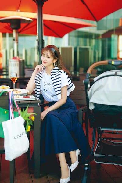 カーディガン¥28,600/マカフィー(トゥモローランド) Tシャツ(バンダナSET)¥16,500/ルーニィ スカート¥49,500/ANAYI パンプス¥34,100/ツル バイ マリコ オイカワ バッグ¥61,600/ロンシャン(ロンシャン・ジャパン) ピアス¥13,200/ステラハリウッド パールネックレス¥148,500/ヴァンドーム青山(ヴァンドーム青山本店) カチューシャ¥11,000/acca(acca GINZA SIX店) ベビーカー¥86,900/ピジョン