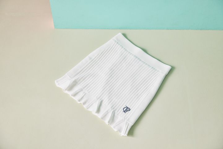 繊細なニットの編地と、裾のフリル使いが大人フェミニンな白ミニ。ソフトでほんのり光沢感のある素材や、エンブレムのワンポイント刺繍がリッチ感を演出。程よくストレッチが効いたニットが、すっきり美ラインをメイク。