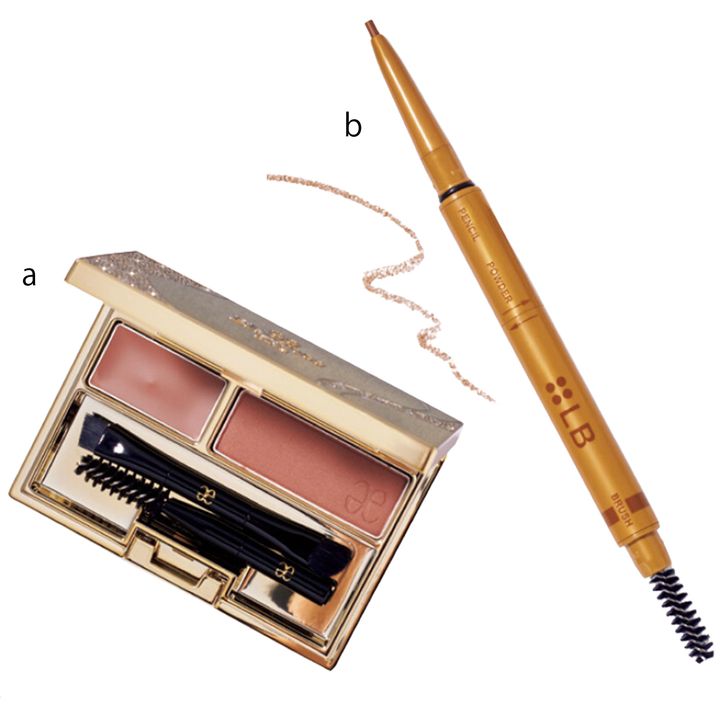 a.密着力に優れたワックスと撥水&撥油性に優れたパウダーがセットになったアイブロウパレット。エレガンス アイブロウデュオパレット WN50 ¥4,180(エレガンスコスメティックス) b.アイブロウパウダーを内蔵したブラシ付きペンシル。LB 3in1アイブロウイエローブラウン¥990(アイケイ)