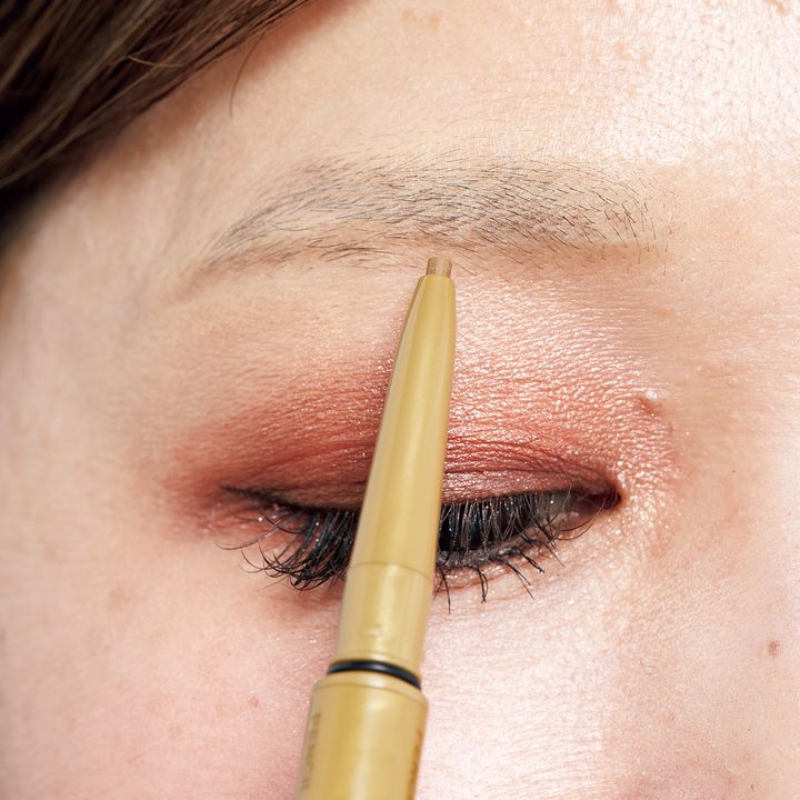 地眉が薄い人はぼんやり見えがちなので、まずイエローブラウンのペンシルでラインを引く。仕上がりがぐっと締まります。