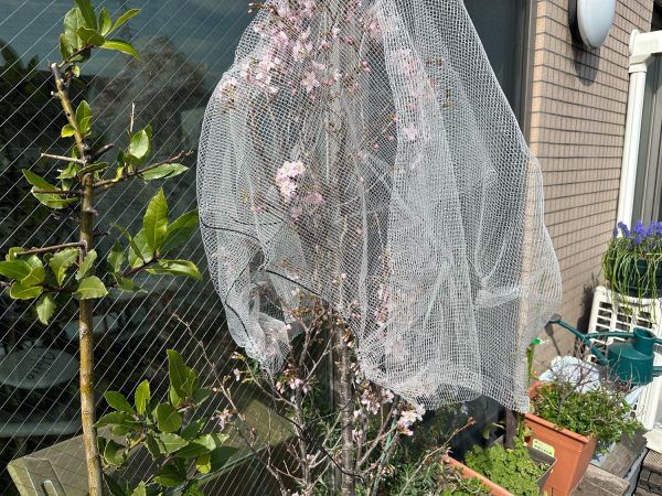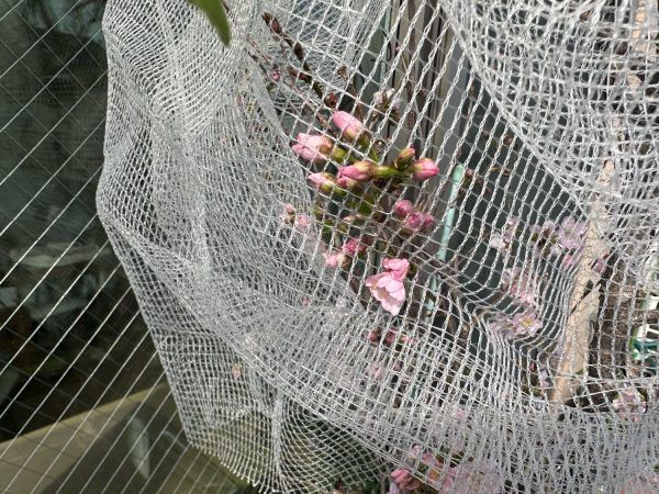 1番困ったのは、鳥に枝を折られることです。ポキポキと折られると、桜の樹も妙な方向に枝を伸ばすようになったりして、剪定をしなければいけないかなと思っています。今年は対策として白いネットをかぶせていたら、ネットの隙間から花が咲いてしまい、仕方なくネットをハサミで切りました…。