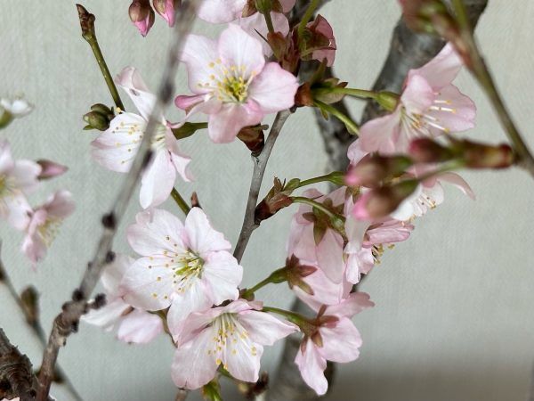 プランター桜の1番いいところは、好きな場所に持ち運べることです。家の中でお花見できるのは、とっても良い気分。わが家の桜は、啓翁桜という種類です。散るときに花びらが舞ったりしないので掃除も楽です。開花が少し早く、我が家の桜が終わる頃にたまプラーザの駅前の桜が咲くのも、長い期間お花見を楽しめて気に入っています。