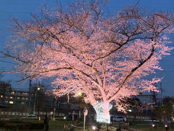 こちらの写真は2022年のものです。駅前は満開になる前のもの。美しが丘公園のライトアップが美しいですね。